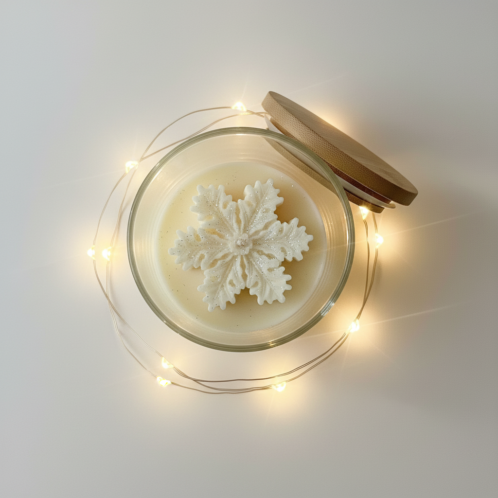 Sveča v kozarcu je v celoti ročno delo. Narejena je iz 100% sojinega in repičinega voska, z dodanimi biorazgradljivimi bleščicami. Diši po jabolku in cimetu.