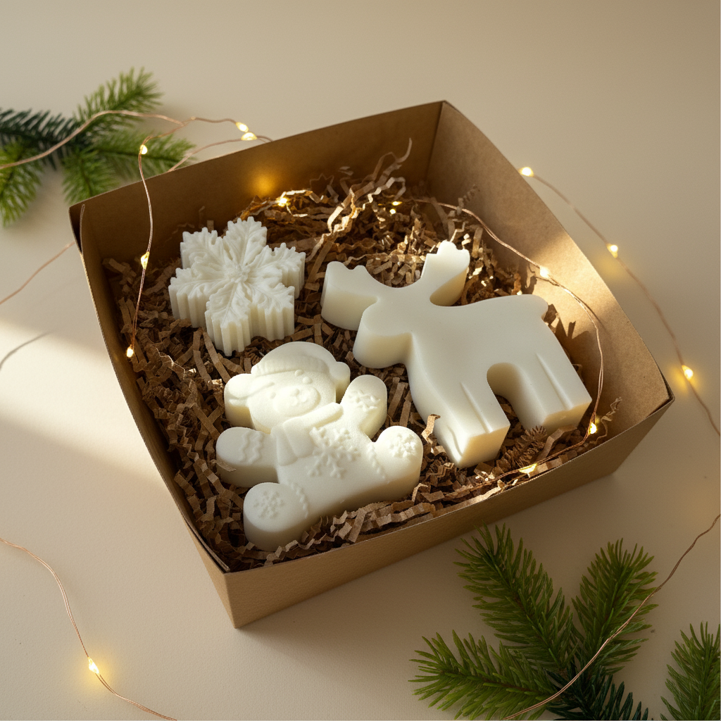Paket treh svečk iz 100% sojinega in repičnega voska. Vsebuje sveče v obliki snežinke, medvedka in jelenčka. Ročno delo, odlična ideja za darilo ali kot okras interierja.