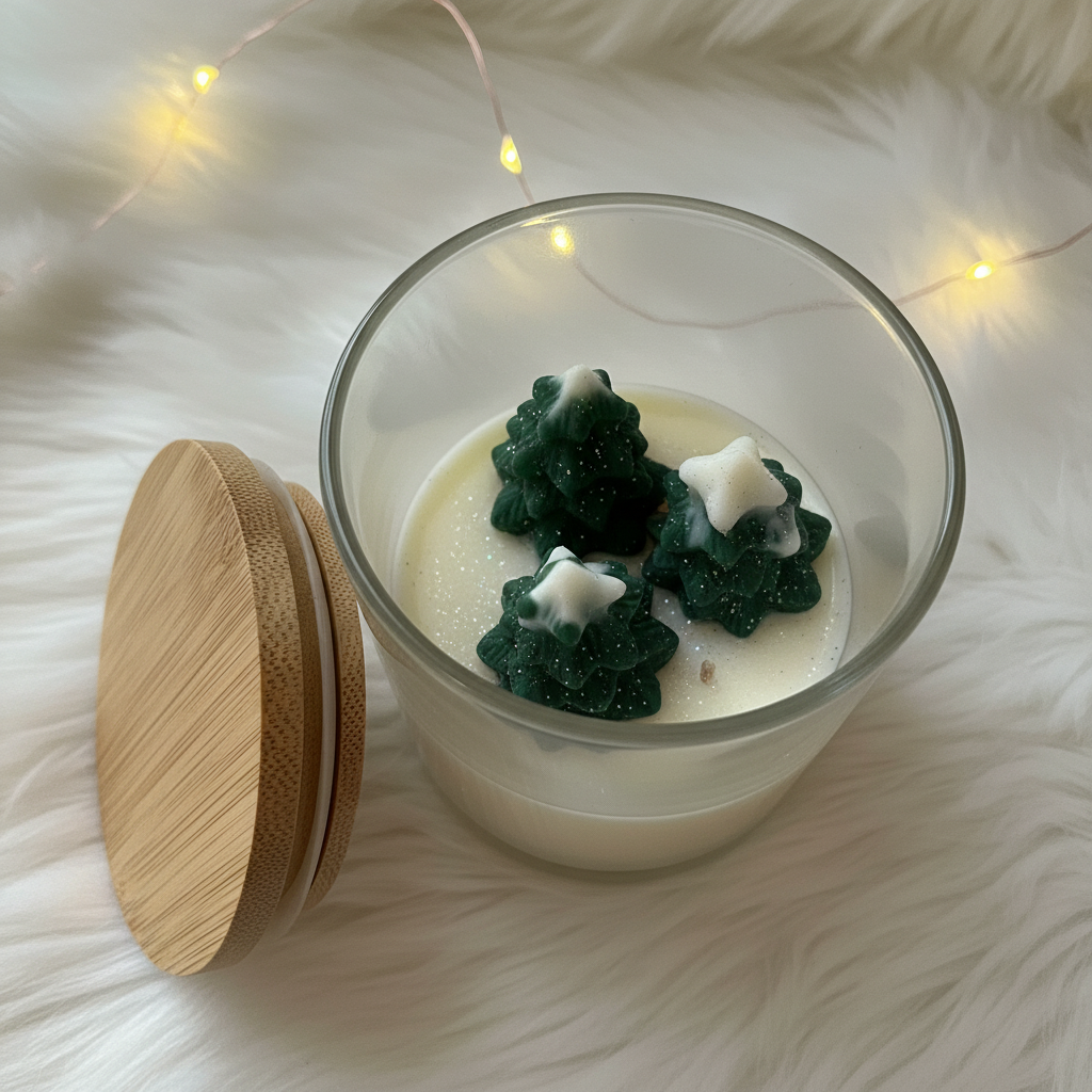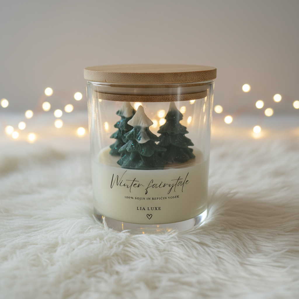 Sveča v kozarcu je v celoti ročno delo. Narejena je iz 100% sojinega in repičnega voska, z dodanim vonjem jabolka in cimeta. Okrašena je z zasneženimi smrečicami in biorazgradljivimi bleščicami